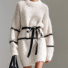 ElevenOra Chic Casual Cream White Striped Round Neck Long Sleeve Belted Oversized Fuzzy Knit Mini Dress