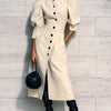 ElevenOra Chic Elegant Cream White Faux Suede Round Neck Single-Breasted Puff Sleeve Tailored Waist Slim-Fit Midi Dress