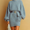 ElevenOra Chic Elegant Gray Round Neck Long Lantern Sleeve Loose Belted Knit Mini Dress