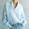 ElevenOra Chic Elegant Light Blue Shawl Collar Long-Sleeve Loose Ribbed Knit Sweater Top