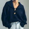 ElevenOra Chic Elegant Navy Blue Lapel Long-Sleeve Gold Button Details Oversize Knit Sweater Top