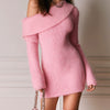 ElevenOra Chic Elegant Pink One Shoulder Long Sleeve Slim-Fit Ribbed Knit Mini Dress