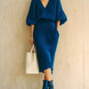 ElevenOra Chic Elegant Royal Blue V-Neck Half Sleeve Oversized Sweater Ribbed Hem Midi Skirt Knit Two-Piece Set