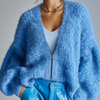 ElevenOra Stylish Casual Blue V-Neck Zipper-Front Loose Plush Knit Cardigan