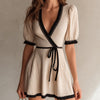 ElevenOra Chic Elegant Beige Deep V-Neck Short-Sleeve Tailored Waist Black Trim Detail Tie Waist A-Line Ribbed Knit Mini Dress
