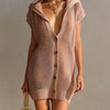 ElevenOra Chic Elegant Pink Hooded Single-Breasted Short-Sleeve Loose-Fit Hollow-Out Breathable Knit Mini Dress