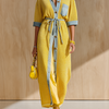 ElevenOra Chic Elegant Yellow Patchwork Denim Lapel Collar Button-Front Loose-Fit Drawstring Waist Loose-Fit Knit Maxi Dress
