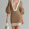 ElevenOra Stylish Brown V-Neck Puff Sleeve Loose Knit Dress Mini Dress