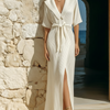 ElevenOra Stylish Elegant White Sailor Collar Short-Sleeved Loose-Fit Waist Tie Side Slits Ribbed Knit Maxi Dress