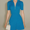 ElevenOra Chic Casual Royal Blue Zipper-Up Lapel Short-Sleeve Tailored Waist A-Line Ribbed Knit Mini Dress