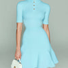 ElevenOra Chic Elegant Blue Mock Neck Button-Front Short-Sleeve Tailored Waist A-Line Ribbed Knit Mini Dress