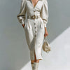 The ElevenOra Casual Office Cotton Blend Waffle Lapel V-Neck Single-Breasted Belted Long Lantern Sleeve Midi Dress presents a perfect blend of comfort and style. Crafted from a high-quality cotton blend, this dress promises a relaxed yet sophisticated look that transitions seamlessly from the office to a casual outing.