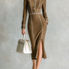 ElevenOra Casual Office Shirt Collar Button Front Piping Detail Fitted Long Sleeve Side Slit Midi Dress
