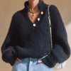 ElevenOra Chic Casual Black V-Neck Button Details Long Lantern Sleeve Oversized Sweater Top