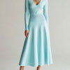 ElevenOra Chic Elegant Baby Blue V-Neck Tailored Waist Long Sleeve Ribbed Knit Maxi Dress