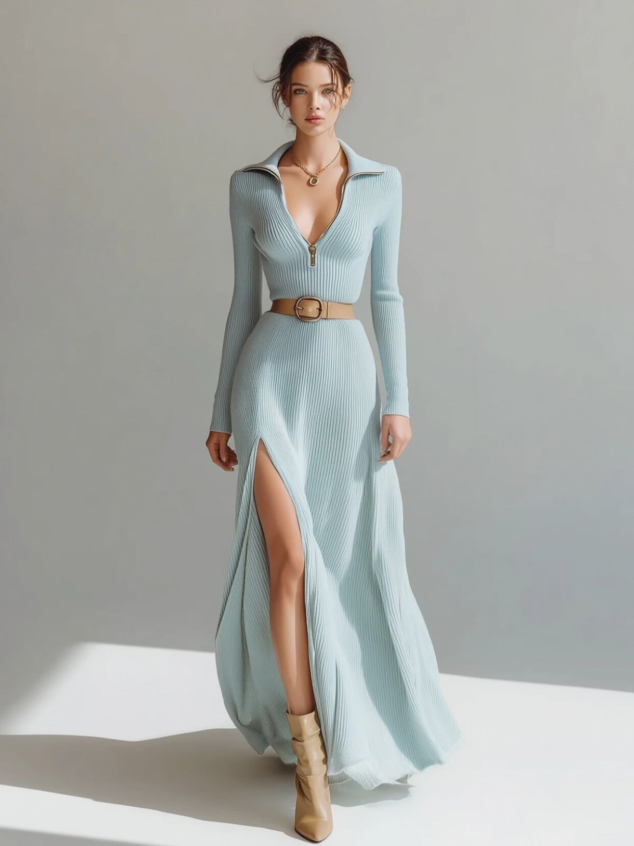 The ElevenOra Stylish Baby Blue Knit Maxi Dress is designed to impress with its elegant and contemporary style. Crafted from a soft knit fabric, this dress offers a luxurious feel and ensures comfort throughout the day. The thoughtful design features a zip-up front, lapel collar, and a belted waist for a tailored silhouette, adding a touch of sophistication to your wardrobe.