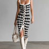 ElevenOra Chic Elegant Black-White Heart Pattern Strappy Single-Breasted Slim-Fit Knit Midi Dress