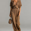 ElevenOra Chic Elegant Brown Button-Up Lapel Collar Half-Sleeve Elastic Waist Loose Fit Ribbed Knit Maxi Dress
