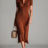 ElevenOra Chic Elegant Caramel Brown Lapel Collar Button-Front Short-Sleeve Slim-Fit Flared Hem Ribbed Knit Bodycon Midi Dress
