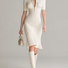 This midi dress can be effortlessly styled for a range of occasions. Pair it with strappy heels and a clutch for a dinner party or a formal event. For a more casual look, consider pairing it with ankle boots and a crossbody bag. The cream white fabric allows for versatile accessory choices, from bold colors to understated metallics.