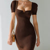 ElevenOra Chic Elegant Dark Brown Square Neck Short Puff Sleeve Slim-Fit Ribbed Knit Mini Dress