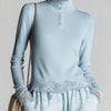 ElevenOra Casual Chic Light Blue Lace-Trimmed Turtleneck Button-Detail Elegant Knit Top