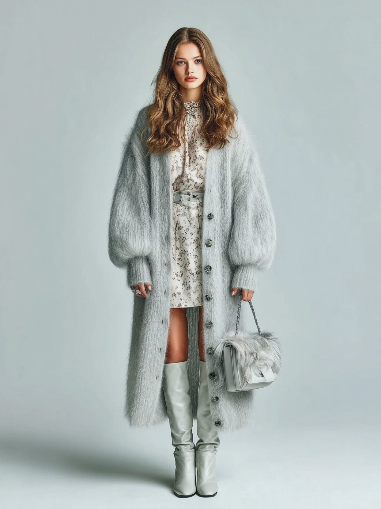 The ElevenOra Casual Chic Light Gray Fuzzy Extra-Long Single-Breasted Puff Sleeve Knit Cardigan blends luxurious coziness with an oversized, fashion-forward silhouette. Crafted from a plush, fuzzy knit, this cardigan delivers exceptional warmth and a sumptuous hand feel. The extra-long length offers flattering coverage and a dramatic, contemporary look, while the single-breasted closure keeps the lines clean and versatile. The voluminous puff sleeves add a playful yet refined touch, making this piece perfect for layering over dresses, skirts, or slim trousers. Ideal for chilly days, travel, or elevating everyday outfits with a soft, tactile aesthetic.