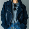 ElevenOra Casual Cool Navy Blue Washed Twill Cotton Blend Lapel Zip-Front Cropped Biker Jacket