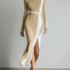 ElevenOra casual Office Colorblock Cotton Blend Round Neck Slim Slit Long Sleeve Maxi Dress