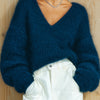 ElevenOra Casual Vintage Navy Blue Deep V-Neck Chunky Knit Slouchy Fuzzy Sweater