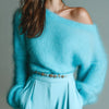 ElevenOra Chic Casual Baby Blue One-Shoulder Oversized Long-Sleeve Fuzzy Mohair Knit Sweater