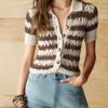 A lightweight, slim-fit knit top that blends classic stripes with modern openwork detailing. This beige-and-camel striped piece features a folded lapel collar and a button-front placket, creating the look of a cropped cardigan worn as a polished top. Short sleeves and a delicate hollow-out knit pattern add breathable texture and a summery touch, while the streamlined silhouette flatters the waist for an elegant yet relaxed look.