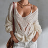 ElevenOra Chic Casual Beige Deep V-Neck Long-Sleeve Loose-Fit Hollow-Out Ripped Knit Sweater Top