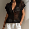 A modern, breathable knit cardigan designed for effortless layering and everyday chic. This black short-sleeve top features a stand collar, a full-length zipper front and an openwork (hollow-out) knit pattern that adds texture and subtle airiness. The relaxed, loose fit makes it comfortable for warm-weather wear or transitional layering.