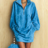 ElevenOra Chic Casual Blue Faux Suede Zip-Up Lapel Lantern Sleeve Oversized Mini Dress