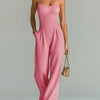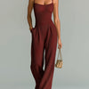 ElevenOra Chic Casual Camel Strappy Sleeveless Tailored Waist Wide Leg Ribbed Knit Jumpsuit
