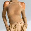 ElevenOra Chic Casual Camel Turtleneck Cutout-Shoulder Long-Sleeve Slim-Fit Knit Top