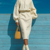 The ElevenOra Chic Casual Cream White Corduroy Set features a stylish and cozy two-piece ensemble perfect for a fashionable yet relaxed look. The set includes an oversized zip-up stand collar sweatshirt and an elastic waist midi skirt, both crafted in a soft cream white corduroy fabric that adds a touch of elegance and comfort to your everyday wardrobe.