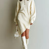ElevenOra Chic Casual Cream White Polo Neck Button-Detail Asymmetric Hem Oversized Knit Midi Dress