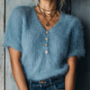 ElevenOra Chic Casual Haze Blue V-Neck Short-Sleeve Button-Front Loose-Fit Fuzzy Knit Sweater Top