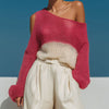 ElevenOra Chic Casual Hot Pink-White Colorblock One-Shoulder Cutout Detail Long-Sleeve Loose-Fit Breathable Knit Sweater Top
