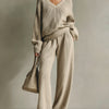 The ElevenOra Chic Cozy V-neck Oversized Long-sleeved Sweater and Wide-leg Pants Ribbed Knit Two-piece Set is an essential addition to any wardrobe. Its blend of comfort, style, and versatility makes it suitable for a range of occasions, offering endless possibilities for creative outfits. Whether lounging at home or stepping out for a casual day out, this set delivers on both comfort and chic style.