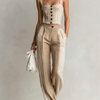 ElevenOra Chic Elegant Beige Striped Button-Front Slim Fit Tank Top Colorblock Cotton Linen Wide-Leg Pants Two-Piece Set