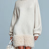 ElevenOra Chic Elegant Beige Turtleneck Long Sleeve Oversized Spliced Faux Lambswool Knit Mini Dress