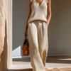 This elegant two-piece set features a sleeveless V-neck ribbed knit vest paired with high-rise wide-leg pants in a warm beige tone. The knit construction gives a soft, slightly textured surface and comfortable stretch, while the relaxed silhouette of the vest and the flowing wide-leg trousers create a modern, minimal look that balances comfort and polish. Ideal for transitional seasons, the set offers a refined casual aesthetic that’s easy to wear from day to night.
