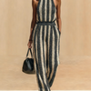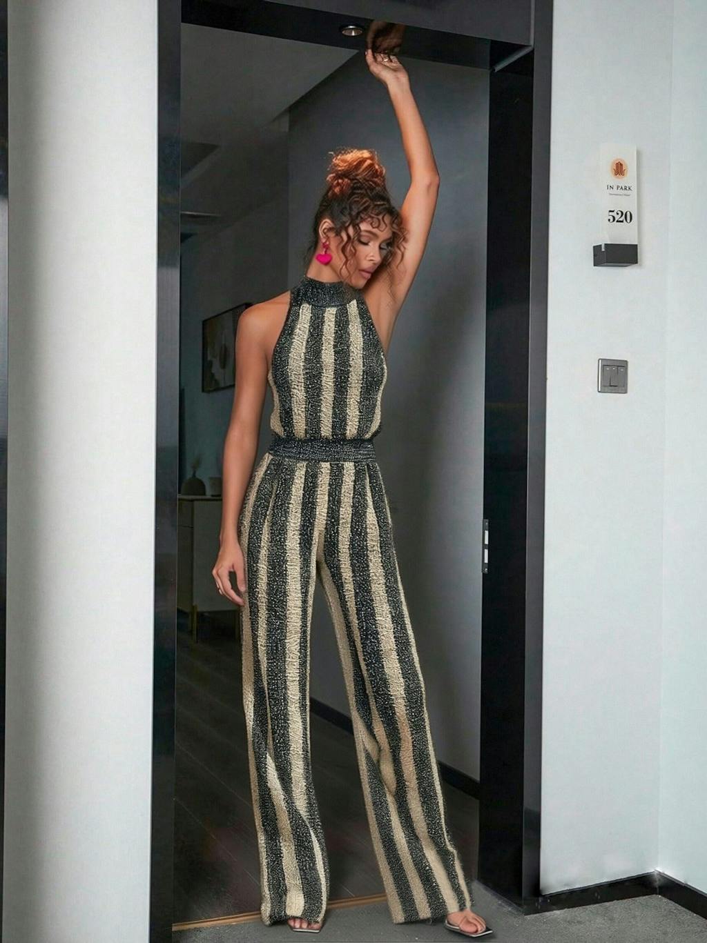 This jumpsuit is made for warm weather! The sleeveless design keeps me cool, and the lightweight knit breathes so well. Wore it to a rooftop party and felt like a total fashionista. The black-beige stripes are timeless—definitely a repeat wear!