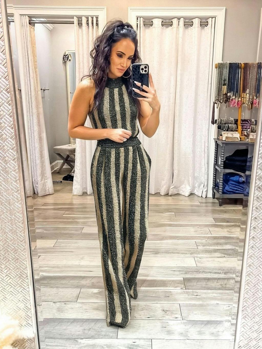 This ElevenOra jumpsuit blends contemporary elegance with everyday comfort. The ribbed mock-neck bodice and wide-leg pants create a versatile, figure-flattering piece that works from brunch to boardroom to evening events. With its striking black-and-beige stripes and easy-care knit, it’s a stylish wardrobe staple that simplifies chic dressing.