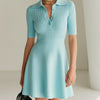 ElevenOra Chic Elegant Blue Button-Up Lapel Collar Slim-Fit A-Line Ribbed Knit Mini Dress