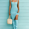 ElevenOra Chic Elegant Blue Square Neck Sleeveless Button-Front Slim-Fit Ribbed Knit Midi Dress