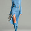 ElevenOra Chic Elegant Blue Turtleneck Tailored Waist Belted Long Sleeve Slit Knit Midi Dress